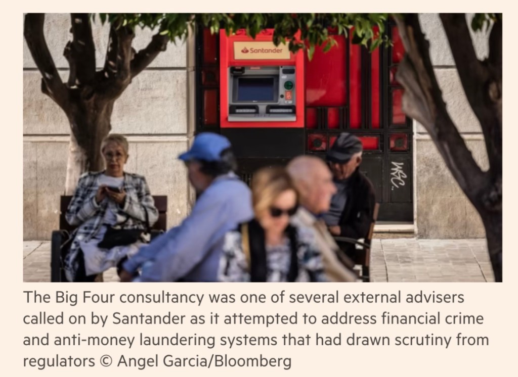 The Big Four consultancy was one of several external advisers called on by Santander as it attempted to address financial crime and anti-money laundering systems that had drawn scrutiny from regulators, according to two of the people.