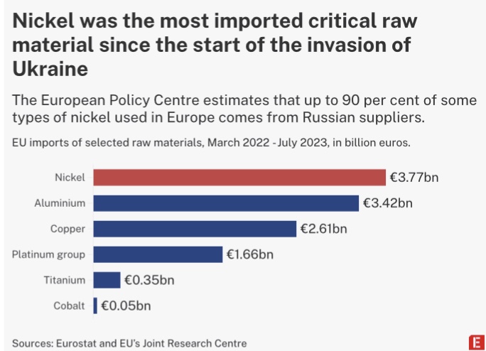 More than €3.7bn arrived between January and July 2023, including €1.2bn of nickel. The European Policy Centre estimates that up to 90 percent of some types of nickel used in Europe comes from Russian suppliers.