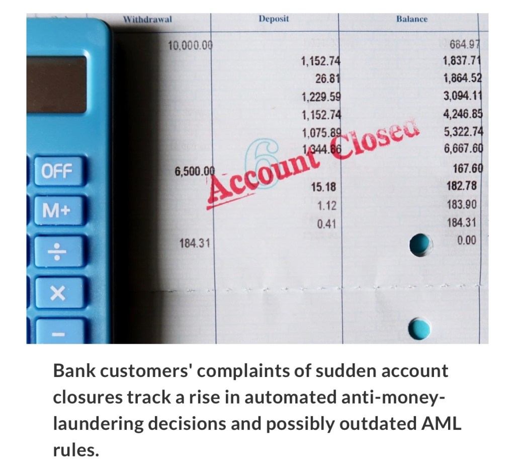 Former anti-money-laundering executives at banks and other experts say there are a few reasons for this apparent rise in account closures. One is a heavy reliance on AML software to monitor transactions overseen by decision makers who don’t know individual customers. Another is outdated rules used to determine which transactions are suspicious. A third is a set of incentives that push banks to rush and not take the time to understand individual cases.