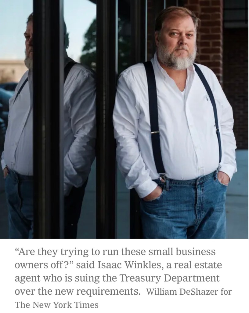 The real-estate manager, Isaac Winkles, is now the co-plaintiff in the association’s federal lawsuit against Ms. Yellen, her agency and the former acting head of the Treasury Department’s Financial Crimes Enforcement Network, known as FinCEN. Mr. Winkles predicted that complying with the new disclosures would be costly to his business and said it had already led to hassles in securing credit from his local banks.