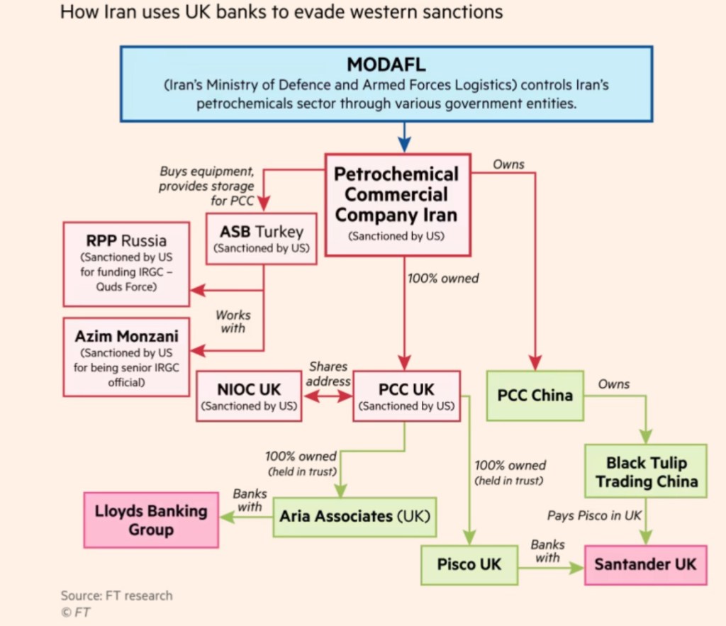 Lloyds and Santander UK provided accounts to British front companies secretly owned by a sanctioned Iranian petrochemicals company based near Buckingham Palace, according to documents seen by the Financial Times.