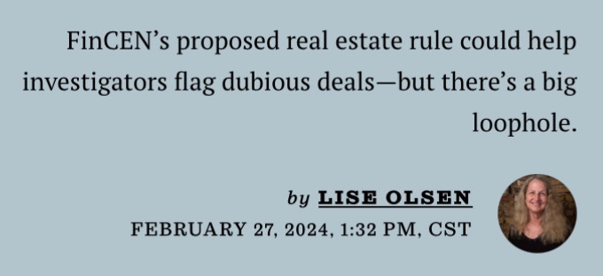 For several years, the U.S. Department of the Treasury’s Financial Crimes Enforcement Network (better known as FinCEN) has required additional data on some real estate deals in Miami, Houston, San Antonio, and other places often targeted by criminals for money laundering. But those Geographic Targeting Orders missed a lot of suspect deals in other places. Our Texas Observer series, “Follow the Money,” found that prosecutors alleged that 50 pieces of Texas real estate, valued at $58 million today had been purchased by Mexican kleptocrats between 1998 and 2017. But only 11, worth less than $7 million, would have been covered by those orders, according to a 2021 Observer analysis of court records by journalist Jason Buch.