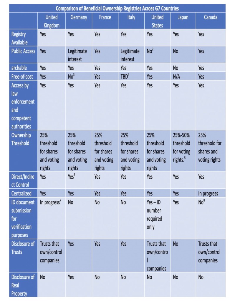 The table below provides a comparison of features for beneficial ownership disclosure regimes across G7 countries: The United Kingdom (UK), Germany, France, Italy, the United States (US), Japan, and Canada.