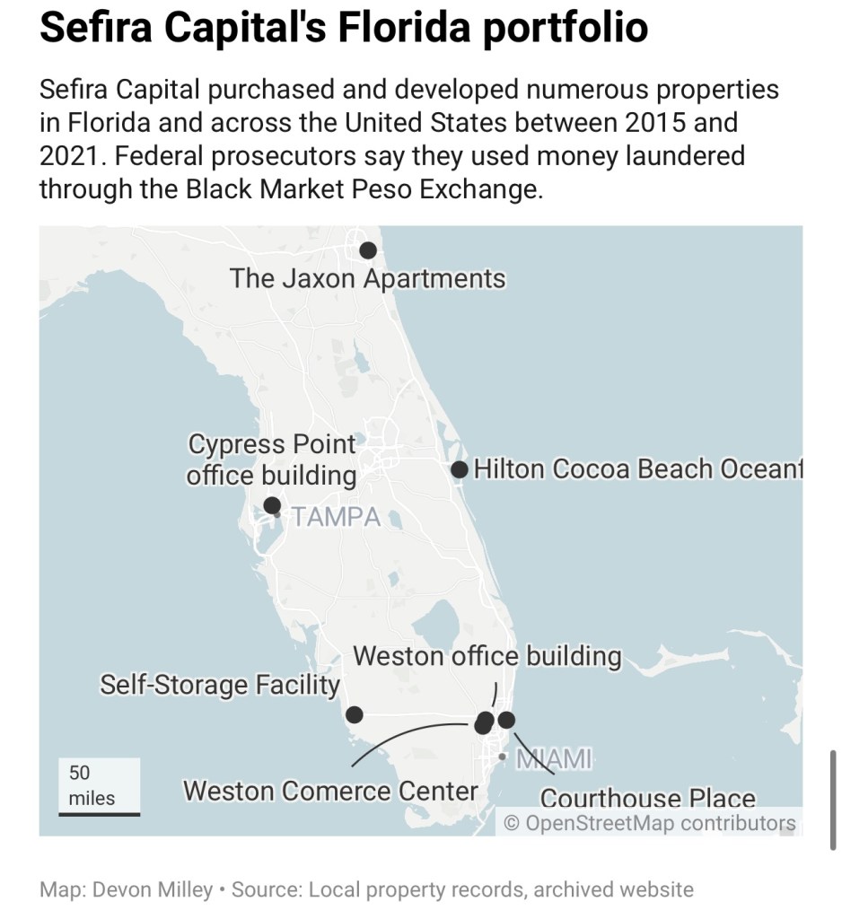 Sefira Capital, a Miami-based real estate investment firm, was accused by federal prosecutors in a 2021 civil forfeiture complaint of accepting millions of dollars worth of drug trafficking proceeds to fund its investments in commercial real estate in Florida and several other states between 2016 and 2019. It bought Courthouse Place in April 2017.