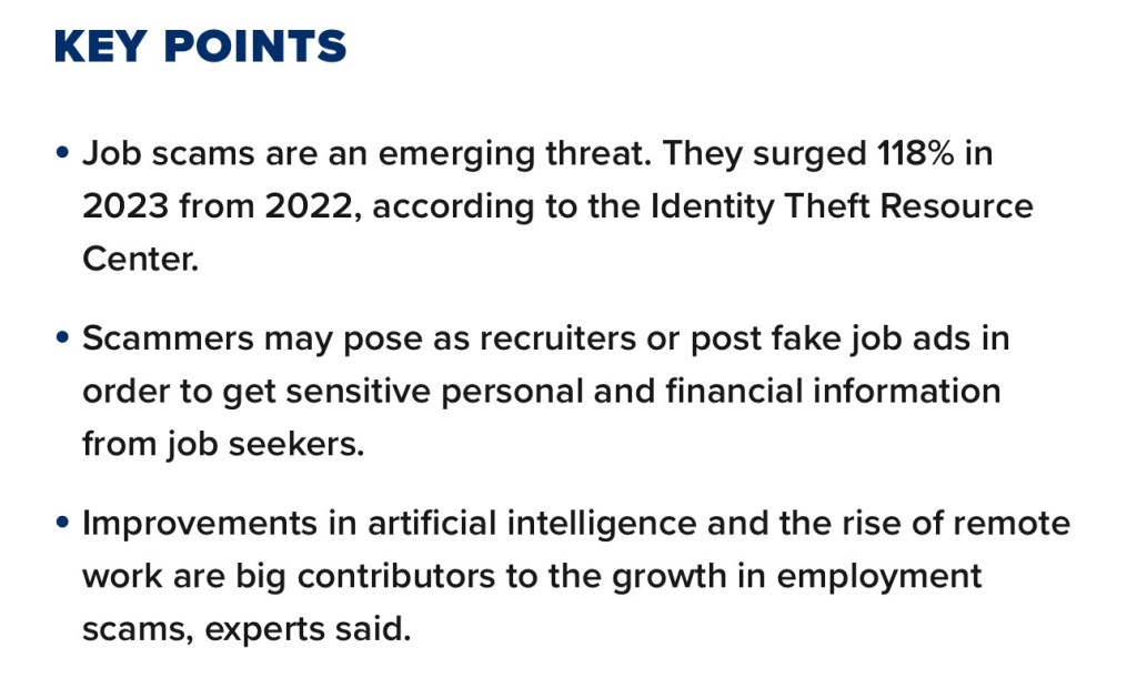 Read full report: https://www.cnbc.com/amp/2024/07/07/job-scams-surged-118percent-in-2023-aided-by-ai-heres-how-to-stop-them.html