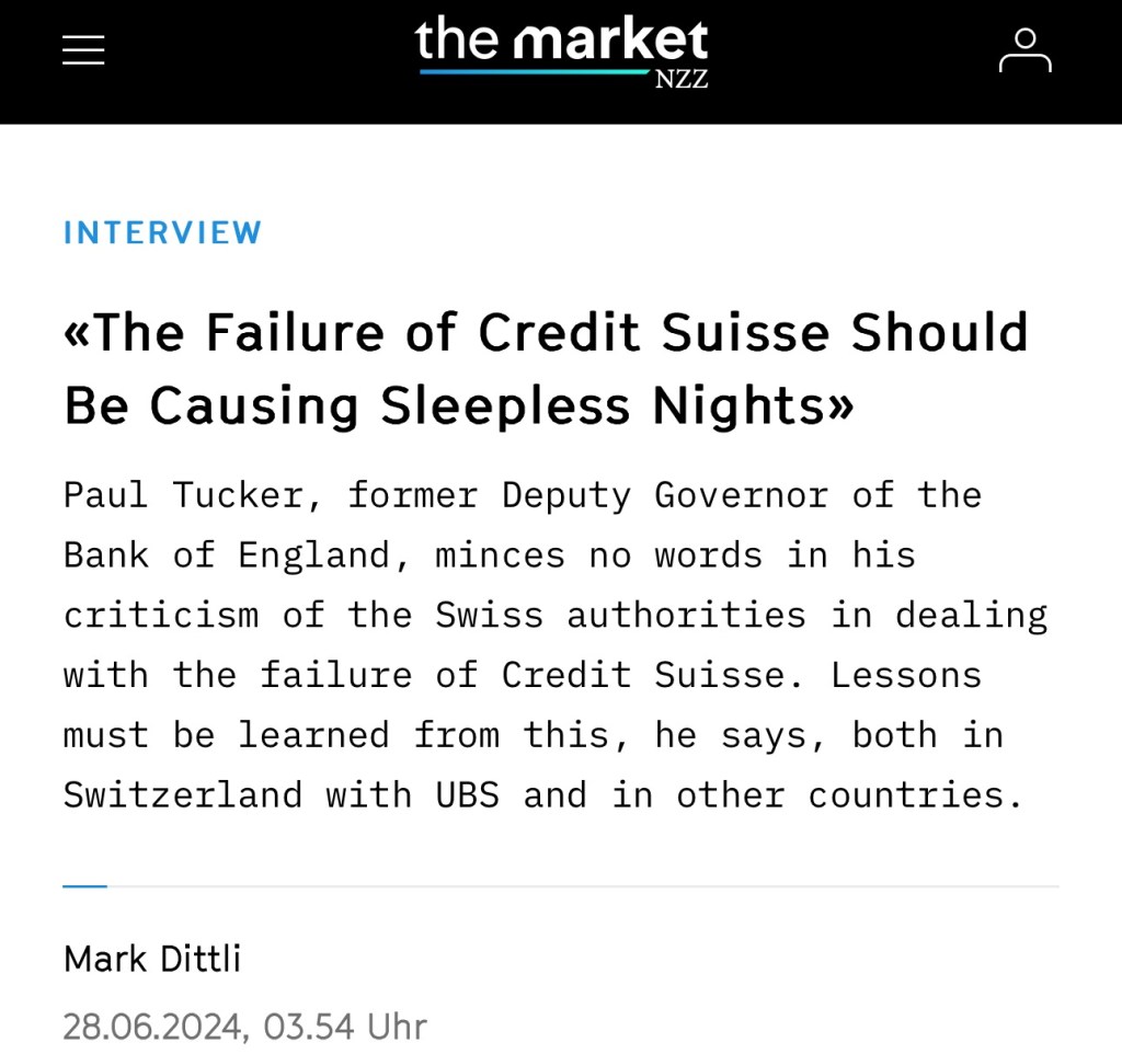 Paul Tucker warns against dismissing the end of CS as an isolated incident that cannot happen again. It was the first major global systemically important bank to go under since the global financial crisis of 2008, and its fall has important lessons to teach: for Switzerland in its dealings with UBS, but also worldwide for dealing with major banks. Nothing less than the sustainability of capitalism is at stake, he says in an in-depth interview with The Market NZZ.