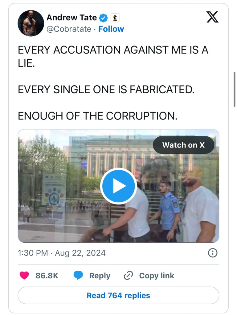 The Tate brothers and two of their associates are currently awaiting trial on separate charges of human trafficking from 2023; in that case, Andrew Tate was also charged with rape.