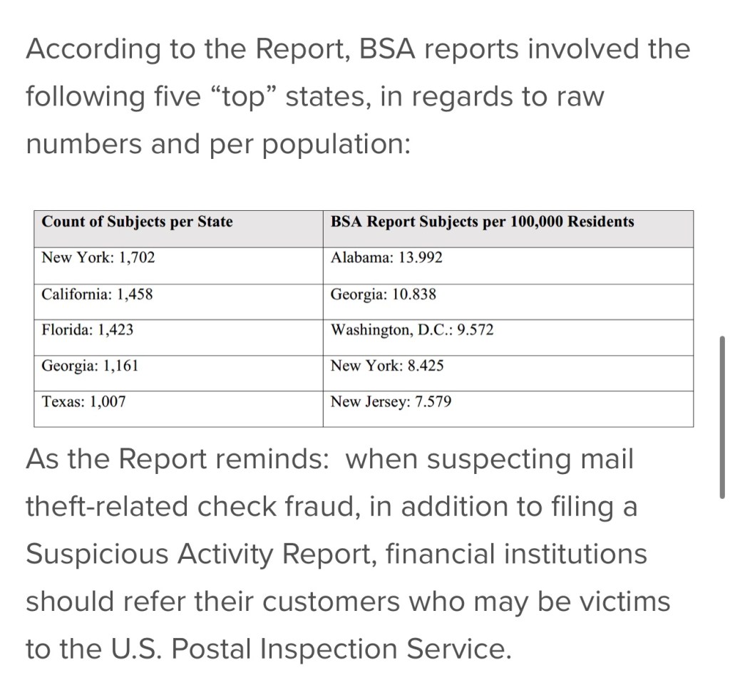 The Report analyzed data received from 15,417 Bank Secrecy Act (“BSA”) reports on mail theft-related check fraud received during the six month period from February 27, 2023 and August 31, 2023. FinCEN identified three primary outcomes after checks were stolen from the U.S. mail: (a) 44% of checks were altered and then deposited; (b) 26% of checks were used as templates to create counterfeit checks; and (c) 20% of checks were fraudulently signed and deposited. The check fraud was reported in every state, with large urban areas reporting more incidents.