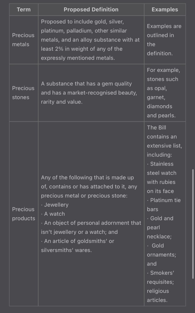 The definitions of “precious metals”, “precious products” or “precious stones” are broad. As you will see in the definitions outlined in the following table, a lot of luxury products and dealers of those products will be captured.