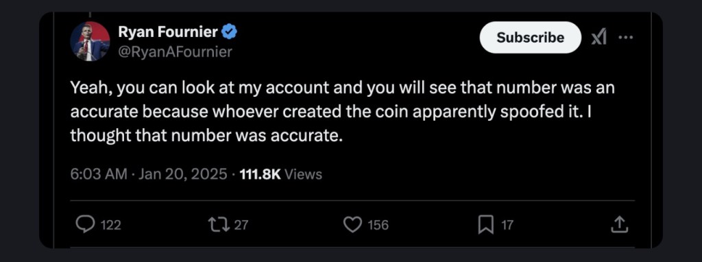 Last Sunday, after TikTok resumed operations in the United States, Ryan Fournier stated in an X Space that he had partnered with a memecoin trader named Asta to launch a TikTok-themed memecoin called ‘TIKTOK’. Asta claimed to be responsible for creating the token and gave 50% of the supply to Fournier, keeping 1% for himself.