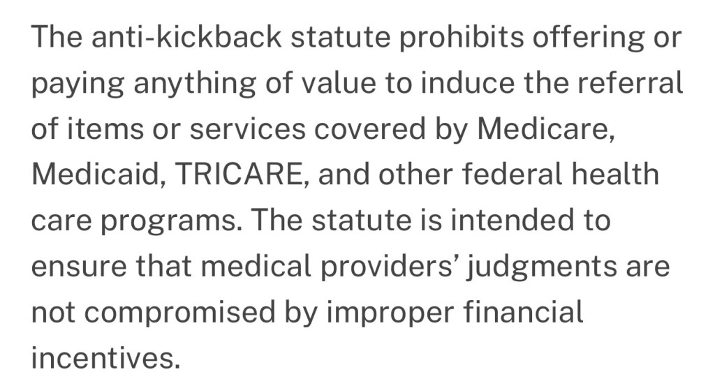 The anti‑kickback statute prohibits offering or paying anything of value to induce the referral of items or services covered by Medicare, Medicaid, TRICARE, and other federal health care programs. The statute is intended to ensure that medical providers’ judgments are not compromised by improper financial incentives.