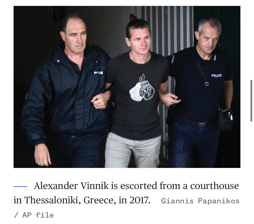 “We didn’t swap the merchant of death for a basketball player,” The U.S. official said, referring to the 2022 exchange of WNBA star Brittney Griner for arms dealer Viktor Bout.Vinnik was arrested in 2017 in a small beachside village in northern Greece and detained at Washington’s request. He was initially extradited to France and later to the United States.