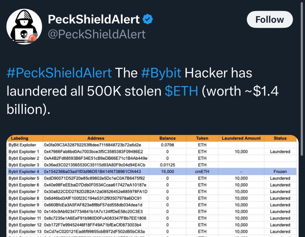 The suspected North Korean hackers behind the theft of more than $1 billion from crypto platform Bybit have completed the initial stage of laundering the funds.