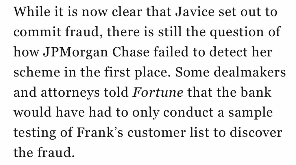 But even as the Wall Street community concludes Javice got what she deserved, some are asking how she was able to con JPMorgan Chase—a giant and sophisticated bank with an army of top-notch lawyers—in the first place.