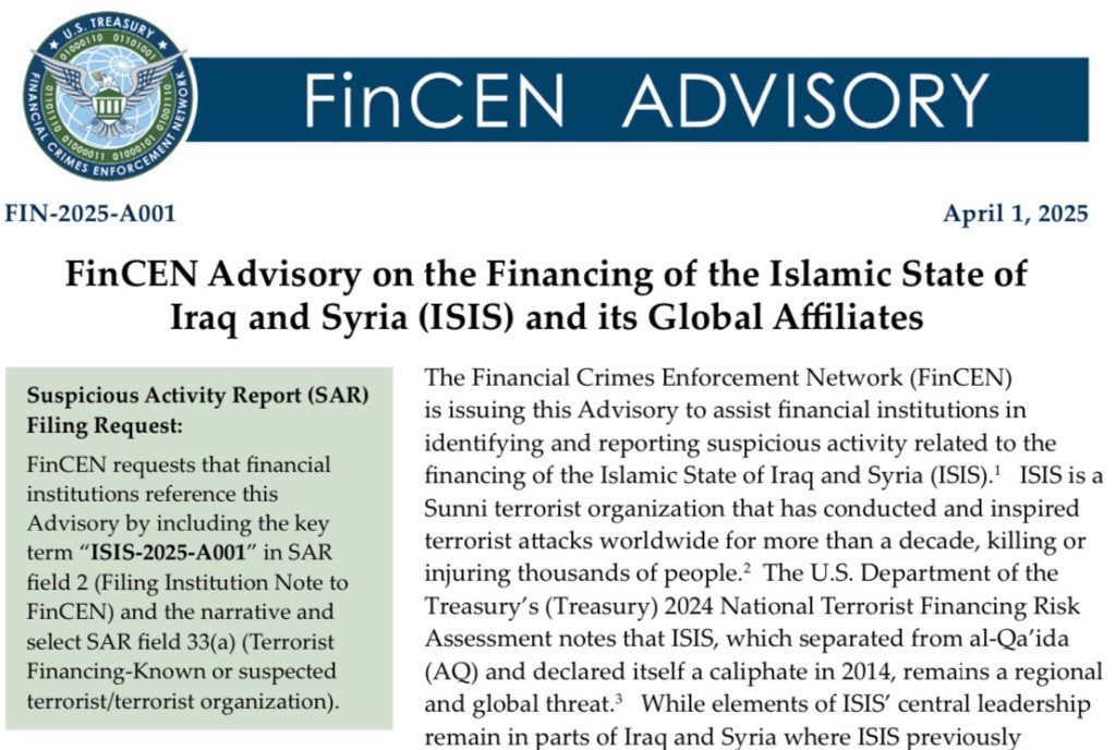 Read full version: https://www.fincen.gov/sites/default/files/advisory/2025-04-01/FinCEN-Advisory-ISIS-508C.pdf